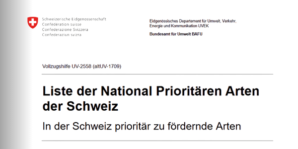 Um die Bemühungen im Artenschutz auf jene einheimischen Arten zu konzentrieren, die aus globaler Sicht am dringendsten Hilfe benötigen, hat der Bund 2011 erstmals die Nationale Priorität für den Artenschutz definiert und die Liste der National Prioritären Arten publiziert. Die Nationale Priorität wird aus der Kombination von zwei Faktoren ermittelt: Die Gefährdung einer Art und die internationale Verantwortung der Schweiz für das weltweite Fortbestehen dieser Art. Die Liste wurde seit 2011 zweimal revidiert (2019, 2025).