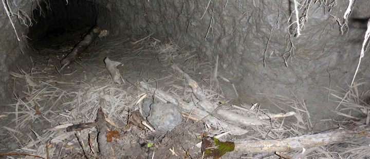 Ausreichend steile Ufer werden vom Biber oft genutzt, um seinen Bau zu graben. Leider kommt es vor, dass diese Bauten einstürzen, und wenn sie sich unter einem Weg oder einer Strasse befinden, bricht die gesamte Infrastruktur mit ein. Auch wenn die erste Massnahme in der Regel die Reparatur des Weges ist, reicht dies nicht aus, um das Problem langfristig zu lösen. Dazu müssen parallel weitere Massnahmen ergriffen werden.