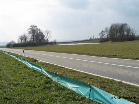 Achtung: in all den oben aufgeführten Fällen bleibt die Barrierewirkung von Randsteinen, Geleisen, Kabelkanälen sowie die Fallenwirkung von Schächten etc. trotzdem bestehen! Können keine Schutzmassnahmen für die Amphibienwanderung getroffen werden, soll versucht werden: