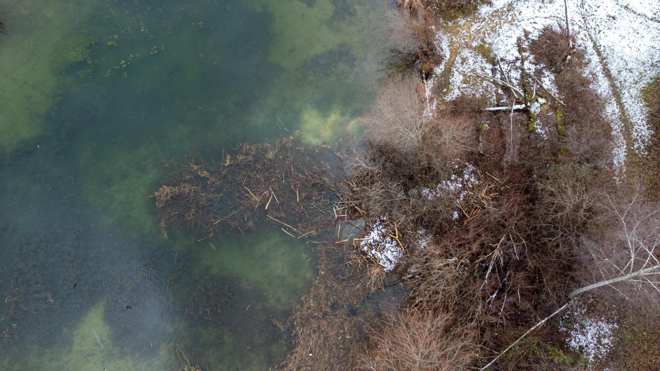 Nicht nur die Burgen werden winterfest gemacht. Auch die Dämme werden jetzt noch schnell erhöht und abgedichtet, damit das Wasser im Biberteich tief genug ist, um den Eingang zur Burg sicher unter Wasser liegt. Der Teich kann dann auch nicht bis auf den Grund zufrieren. Wie aber gelangen sie an Futter, wenn sie nicht unter dem Eis hervorkommen um Bäume zu fällen? Dazu legen sie im Herbst einen Wintervorrat vor der Burg an. Tausende von Ästen werden im Grund verankert, damit sie nicht davonschwimmen. Kubikmeter Holz liegen so quasi «Kühlschrank» vor dem Baueingang. Die Biber brauchen dann nur noch ins kühle Wasser zu tauchen, einen Ast zu holen und diesen im warmen Heim zu fressen.