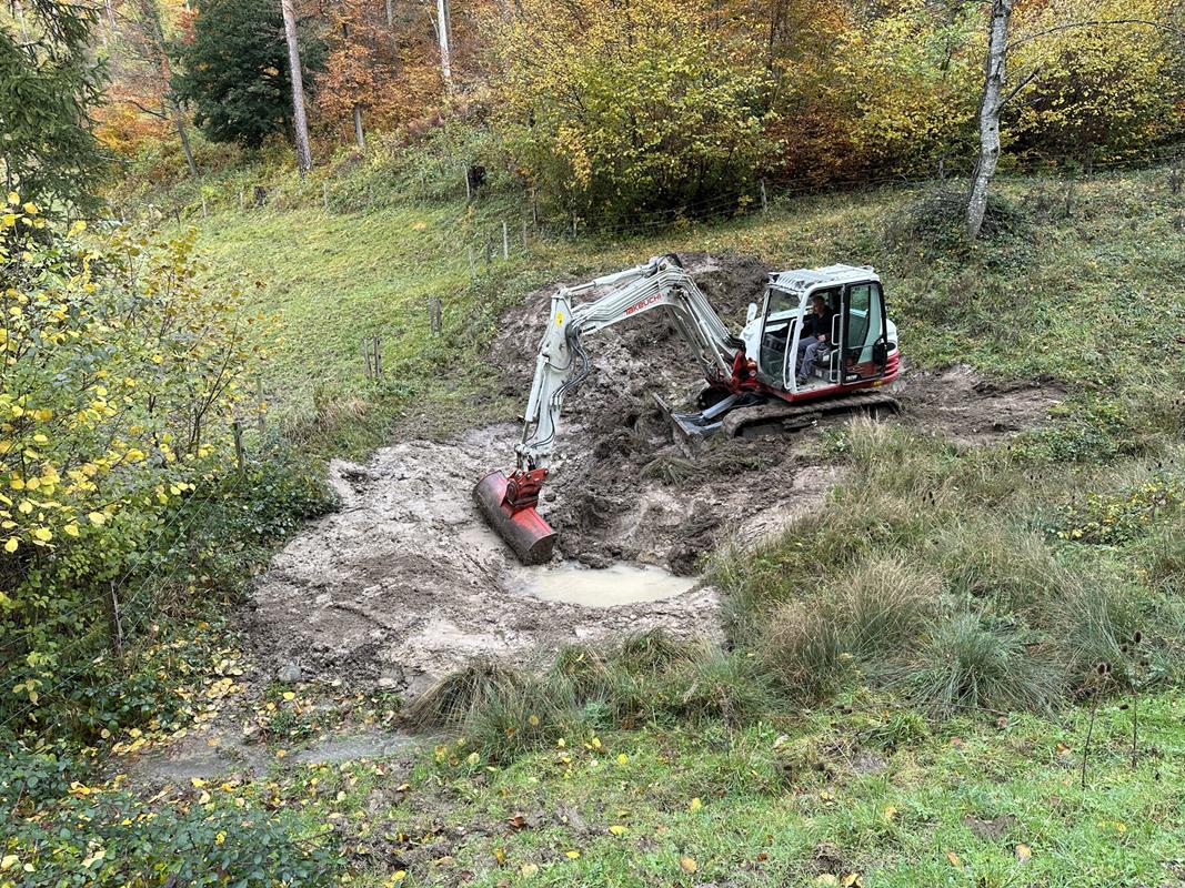 Travaux de dragage lors de la création d'un nouveau plan d'eau pour le crapaud accoucheur (© Mario Lippuner)