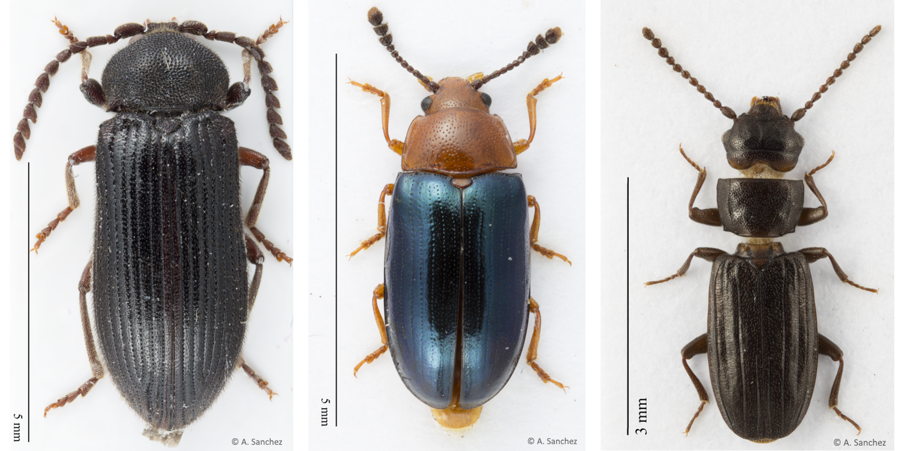 Espèces forestières emblématiques (de gauche à droite): Cerophytum elateroides (Latreille, 1809) ; Triplax aenea (Schaller, 1783) ; Laemophloeus muticus (Fabricius, 1781) (© Andreas Sanchez)