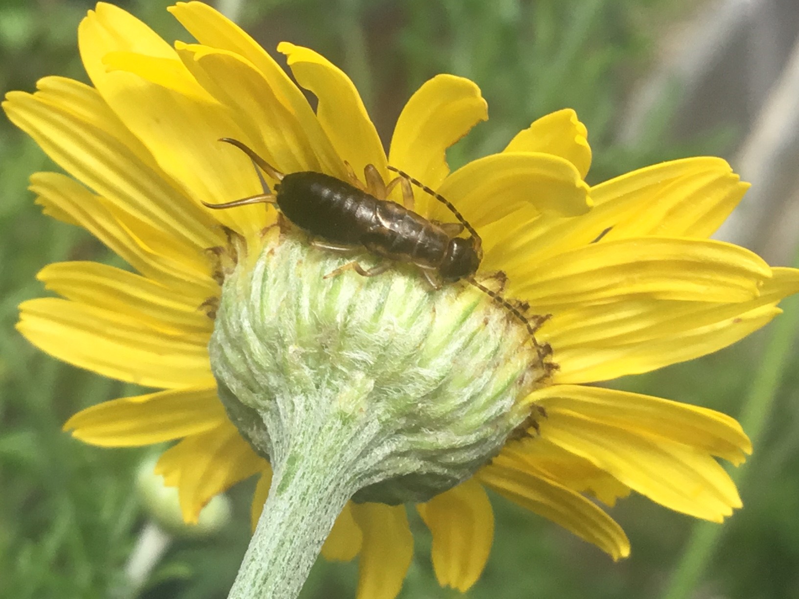 Une nymphe (dernier ou avant dernier stade larvaire) du perce-oreille Forficula auricularia, caché sous une fleur (© Murielle Mermod)