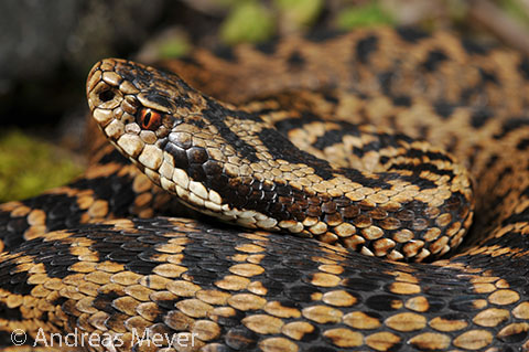 Männliche Kreuzottern sind nach der ersten Häutung im Frühjahr sehr kontrastreich gezeichnet (© Andreas Meyer)