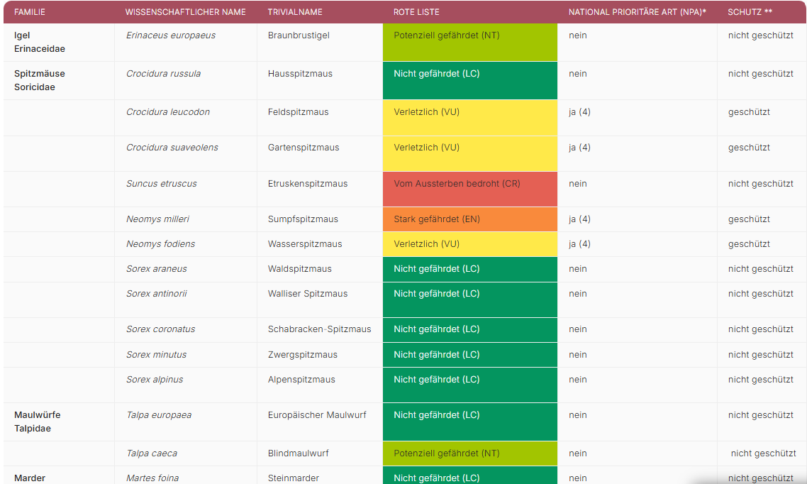 Grado di minaccia e protezione dei piccoli mammiferi in Svizzera