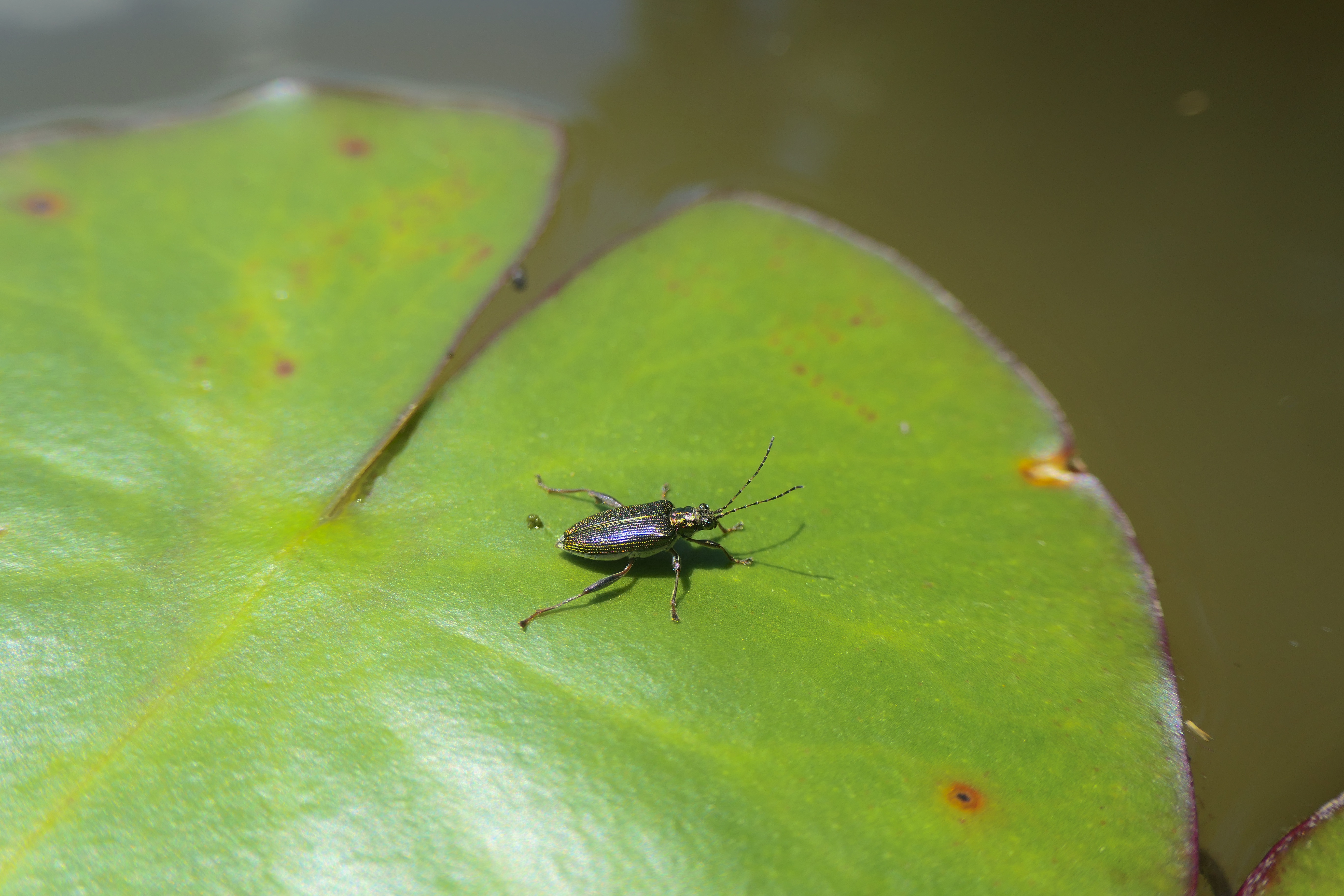Donacia crassipes - Posée sur une feuille de nénuphar blanc. Les donacies riches de 25 espèces en Suisse sont associées aux marais et aux ceintures de végétation de plans d’eau et aux herbiers immergés © Adrienne Sordet