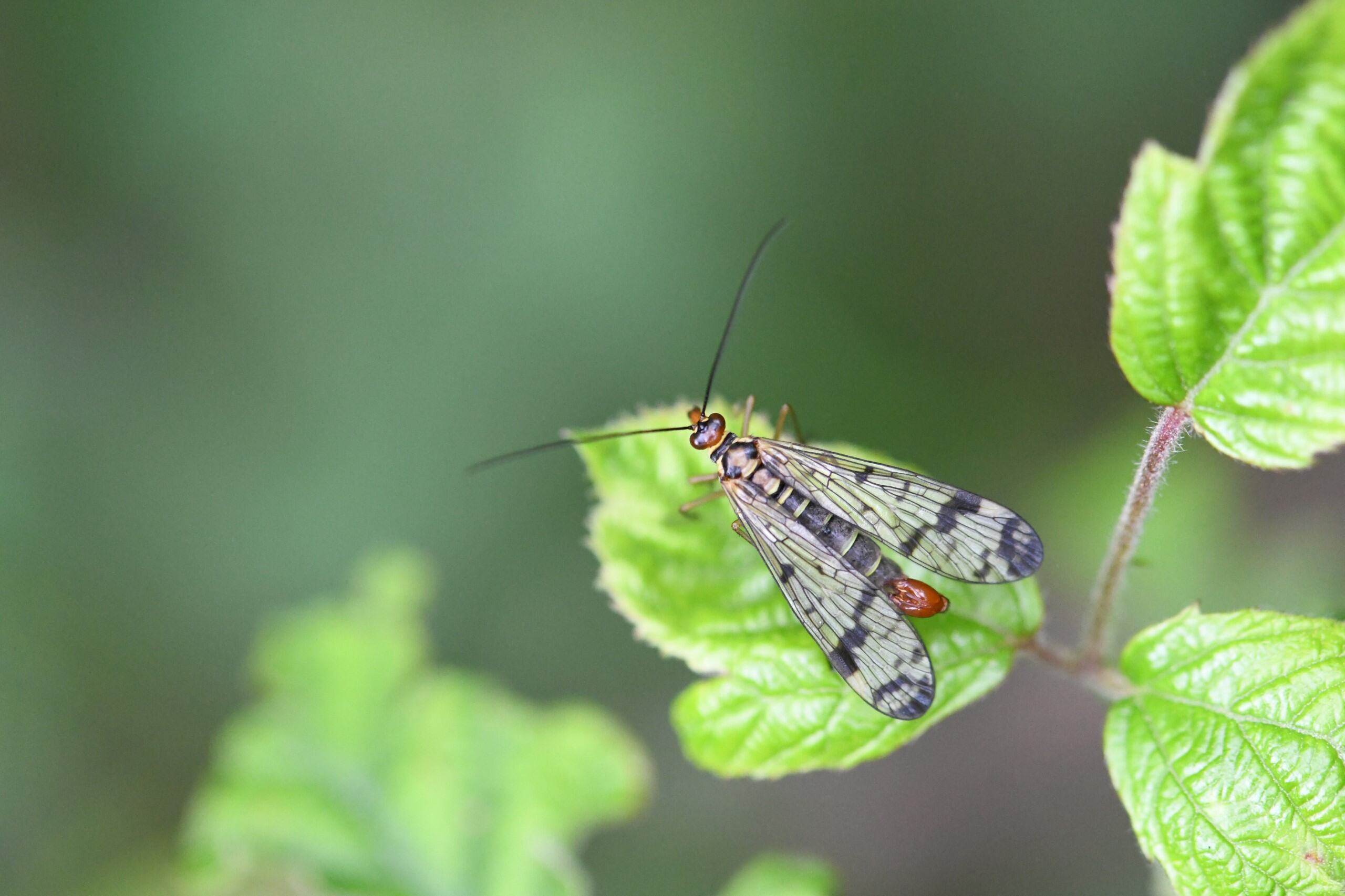Une mouche-scorpion (Panorpa communis) posée sur la feuille d'un arbuste en lisière de forêt (© Christian Monnerat)