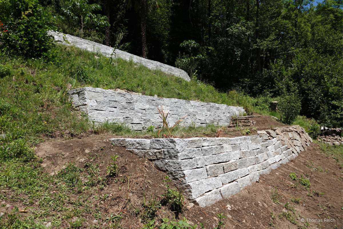 Projet mis en œuvre : Deux murs en pierres sèches ont été reconstruits en 2024, pour une longueur totale d’environ 9 mètres et une hauteur d’environ 90 centimètres. De plus, deux murs en ruine ont été remplacés par des murs en pierres sèches. Au total, 29 mètres de murs en pierres sèches ont été restaurés ou construits à neuf. Environ 20 tonnes de gneiss tessinois ont été utilisées, provenant d’une carrière près d’Iragna et se rapprochant le plus possible de la roche locale sur le plan visuel. Lors de la construction, une attention particulière a été portée à la création de structures idéales pour les reptiles : nombreuses cavités de tailles variées et zones ensoleillées grâce à une construction en gradins. Le mur le plus imposant présente à sa base une profondeur d’environ 90 cm. En plus des quatre murs en pierres sèches, plusieurs tas de pierres constitués de roche locale ont été érigés.