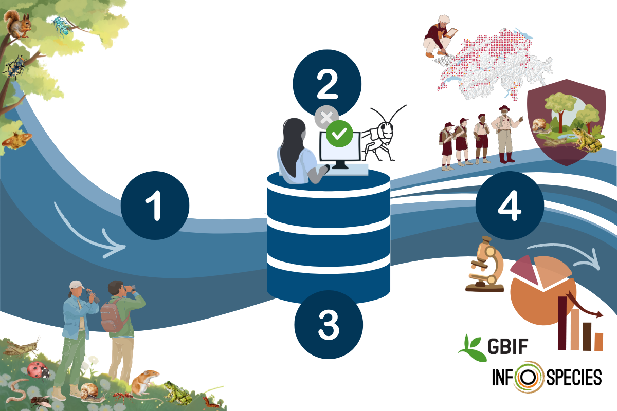 D’une fascinante observation naturaliste sur le terrain à une donnée validée et mise à disposition de la recherche et de la conservation, votre observation suit le flux de données national organisé par les lignes directrices d’InfoSpecies.