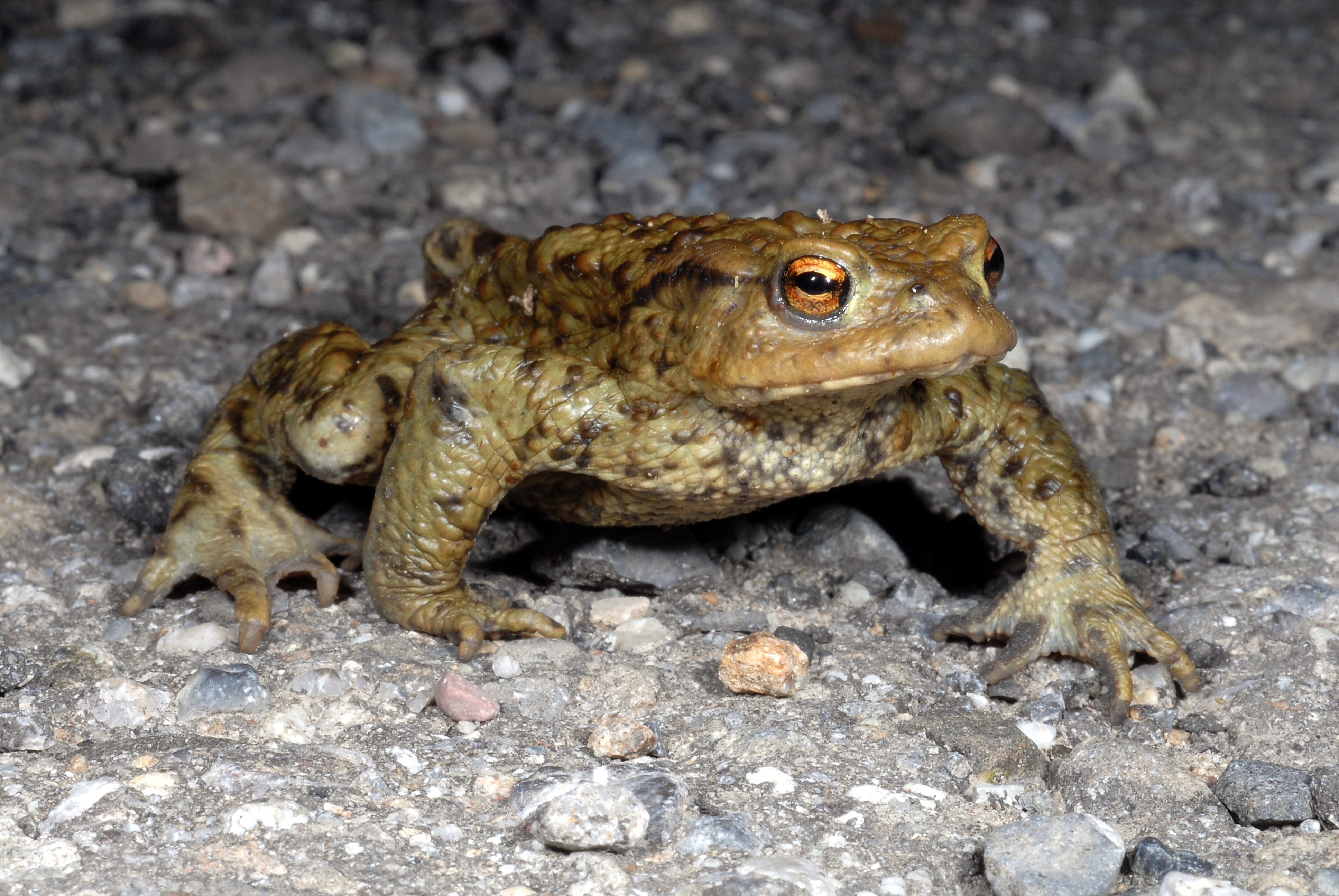 Il Rospo comune, Bufo bufo (Linnaeus 1758), è un anfibio dall'aspetto goffo, con zampe posteriori corte e muso appiattito. Dietro gli occhi, color rame e con pupille orizzontali, si distinguono le grosse ghiandole paratoidi che, in caso di pericolo, possono secernere un liquido vischioso assai tossico, in grado di provocare forti ulcerazioni alle mucose di eventuali aggressori (anche dell'uomo). La colorazione, brunastra, cambia con le stagioni, con le fasi della muta, con la durata della permanenza in acqua ecc., variando dal giallo sabbia al marrone scuro quasi nero. Soprattutto le femmine possono presentare marmorizzature sui fianchi, mentre gli immaturi sono spesso rossastri.