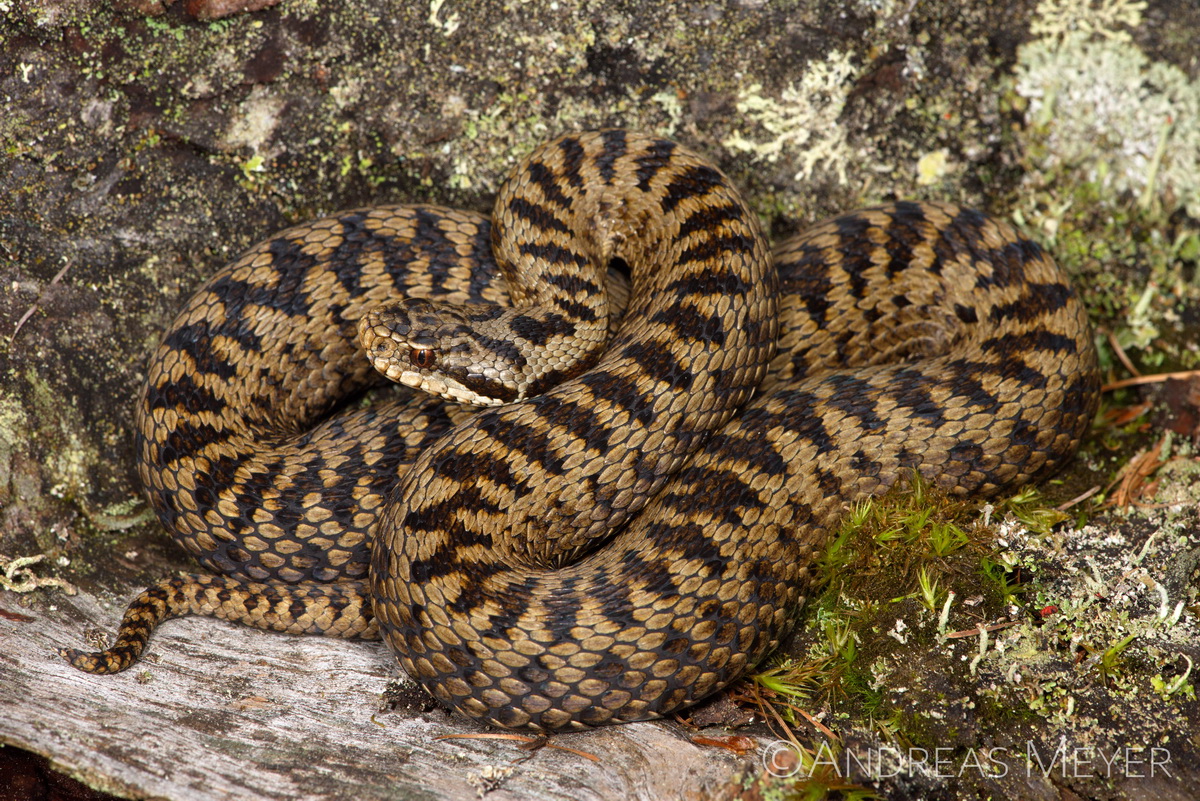 Männliche Kreuzottern sind nach der ersten Häutung im Frühjahr sehr kontrastreich gezeichnet (© Andreas Meyer)